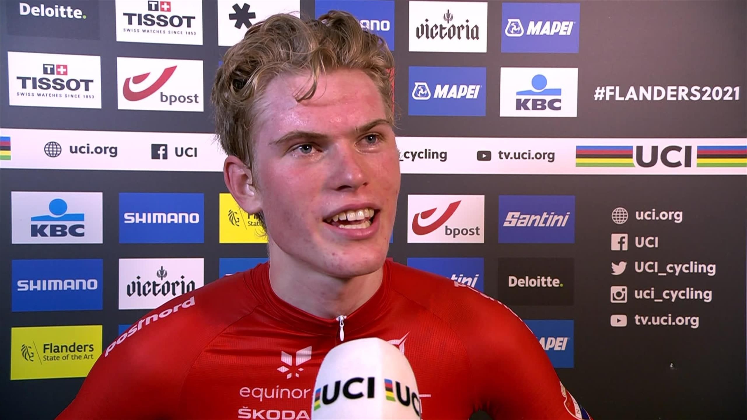 Norway claimed their first medal of the Flanders 2021 World Championships as Per Strand Hagenes smashed the final 10km to win the junior road race rainbow jersey. Cian Uijtdebroeks one of the five Belgians to start had bad luck and was involved in a crash in the first round which prevented him from defending his chances. Contested this Friday morning in Leuven the Juniors Men road race of Worlds Championships saw the solo victory of Per Strand Hagenes.
