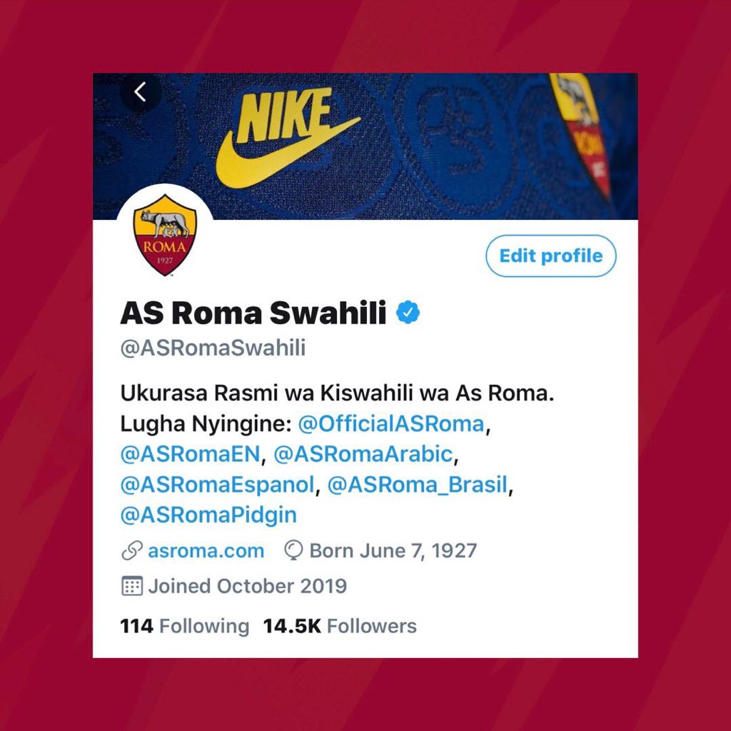 The Twitter account joins AS Romas twitter accounts that post tweets in English Arabic Spanish PortugueseBrasil and Pidgin among other 14 different languages to cater to its worldwide fans. Serie A side AS Roma has officially launched their Swahili Twitter account to engage their followers in East Central and South-Eastern Africa. The club is the first major European football club to launch an official Swahili.